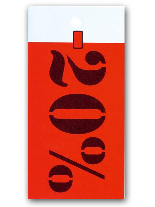 Hangetiket rood met wit, met zwarte bedrukking "20%". 35x70mm, pakket van 250 stuks. Deze stevige, kartonnen prijskaartjes zijn los verpakt en mede daardoor zeer eenvoudig te verwerken. De heldere en opvallende bedrukking zorgt ervoor dat de prijsetiketten goed opvallen. Het ponsgaatje voor de naald van een textieltang maakt het gebruik van deze prijskaartjes nog eenvoudiger.