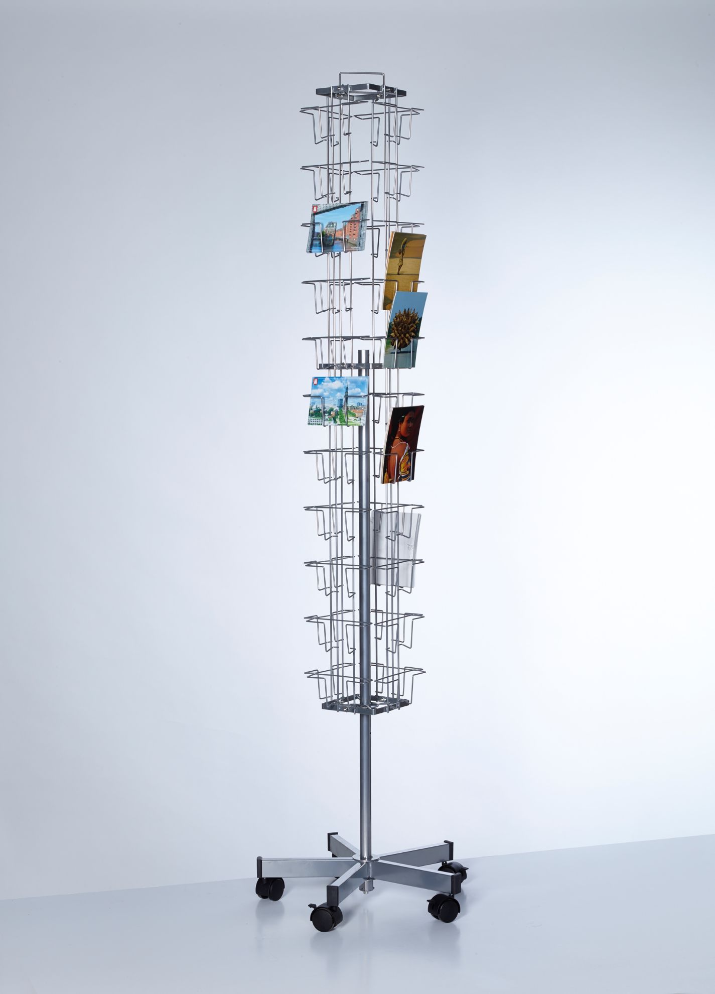 Metalen folderrek draaibaar voor het presenteren van A6 kaarten (10,5x15cm). Er kan gekozen worden voor staande of liggende presentatie of een combinatie hiervan.