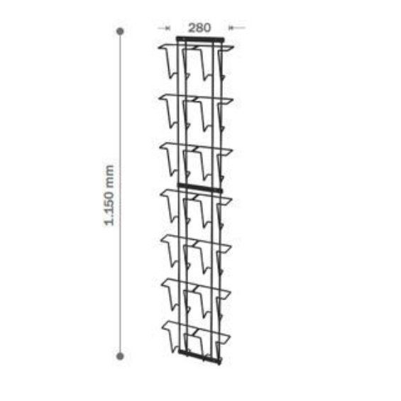 Kaartenrek voor 12 ansichtkkaarten. Hoogte 1150 mm, breedte 340 mm. Geschikt voor kaarten van 168 mm breed. De diepte van een vak is 24 mm. Kleur: zilvergrijs. Een mooi en stevig kaartenrek, gemaakt van metaaldraad. Dit kaartenrek kan op zes plaatsen aan een wand worden bevestigd, waardoor het stevig en recht hangt. Zeer stevig en volautomatisch gelast, waardoor het kaartenrek een zuivere vorm behoudt en de lassen gegarandeerd stevig zijn.