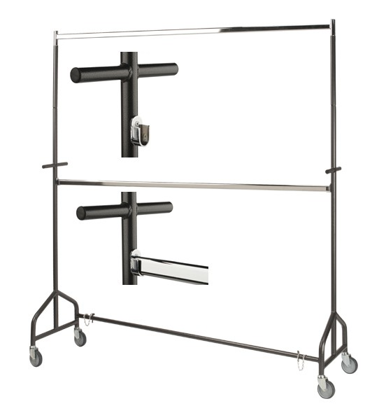 Dit dubbele kledingrek is geschikt voor zware belasting. Formaat 180cm (breed) x 60 x 210cm(hoog). Met extra hangstang op 103 cm. hoogte. Met 4 extra grote wielen van 10cm. Eenvoudig uitneembare onderstang d.m.v. pennen, uitgevoerd in hamerslag (donker-grijs) met verchroomde bovenstang. Dit extra stevige transportrek is ruimtebesparend op te bergen dankzij diagonale onderstang, waardoor de staanders van het kledingrek "genest" kunnen worden. Hierdoor gebuik je voor het opbergen van drie of vier transportrekken evenveel ruimte als voor één conventioneel kledingrek. Bestel bij dit rek eventueel ophoogstukken om het 40 cm hoger te maken.